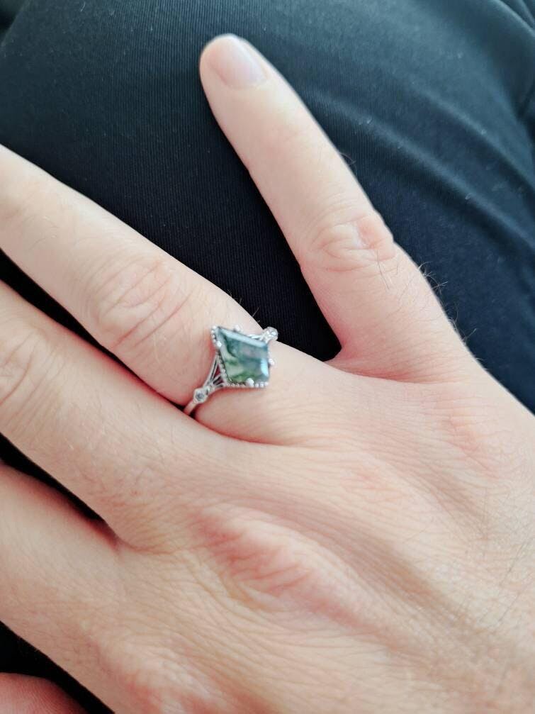 Sterling Silver 925 green moss agate kite shaped ring. Can be engagement, promise or just a beautiful ring for someone who loves jewelry, will make a beautiful gift.